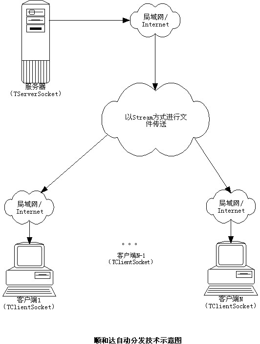 ·自動(dòng)分發(fā):當(dāng)服務(wù)器端版本升級(jí)后,客戶端登陸后自動(dòng)得到服務(wù)器端分發(fā)。讓遠(yuǎn)在全球的客戶端自動(dòng)得到版本升級(jí),使整個(gè)管理系統(tǒng)版本一致。(技術(shù)示意圖)